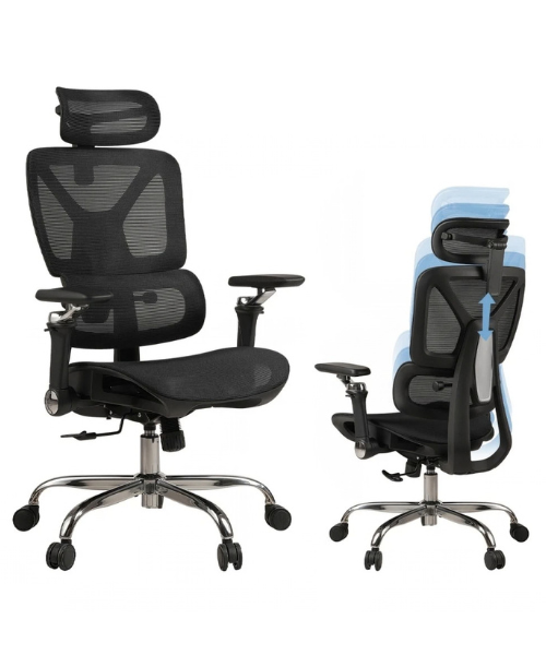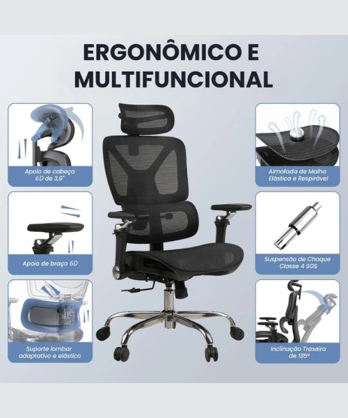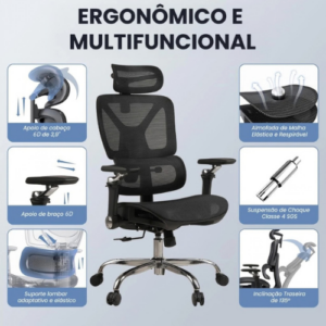 Apoio Lombar e de Pescoço Ajustáveis, Conforto Personalizado—A cadeira conta com um sistema de apoio lombar elástico adaptativo, que se ajusta automaticamente à curvatura das suas costas, proporcionando um suporte contínuo e confortável. O apoio lombar possui 4 ajustes de altura, permitindo que você personalize a posição para máxima comodidade. Além disso, o apoio de pescoço é ajustável, permitindo que você encontre a altura e o ângulo ideais para aliviar a tensão no pescoço e manter a postura correta.