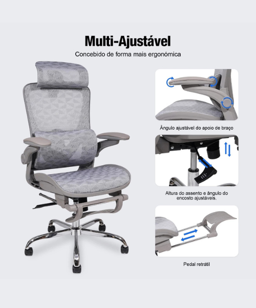Transforme sua experiência de trabalho ou estudo com esta cadeira ergonômica premium, projetada para oferecer o máximo de conforto e suporte personalizado. Ideal para longas horas de uso no escritório ou em casa.
